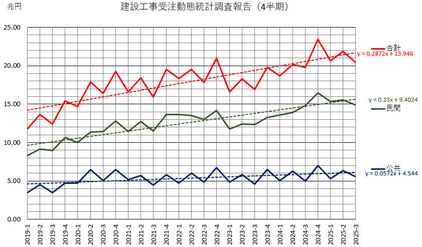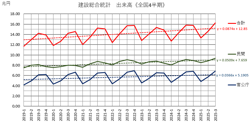 2025年度(2025/4~2025/12)の出来高総計は44.18兆円で前年度比3.1%増加した。うち民間総計は26.77兆円で同3.5%増加し、公共総計は17.42兆円で同2.4%増加した。