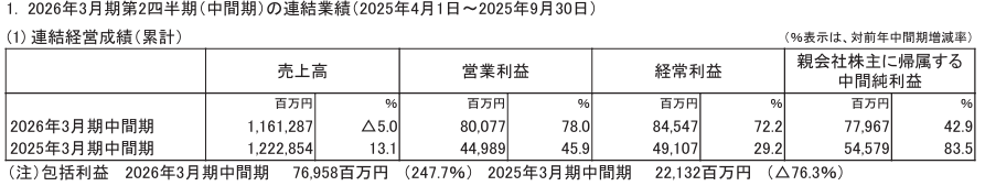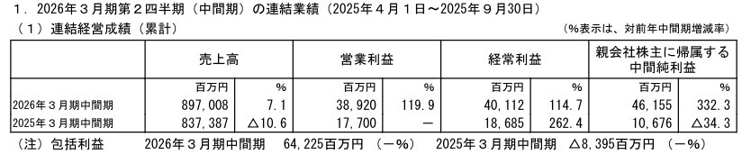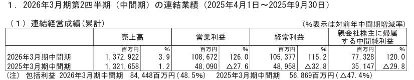 が、2026年3月期第2四半期(中間期)決算短信を発表しました。
