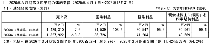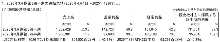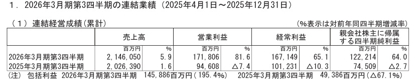 2026年3月期の通期連結業績予想:売上高3.00⇒3.03(兆円)、経常利益2,000⇒2,260(億円)