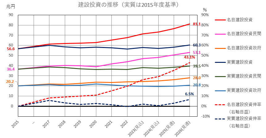 建設投資は、名目値ベースで、2025年度は76兆6,800億円、2026年度は81兆700億円で前年度比5.7%増(実質値ベースでは前年度比3.6%増)と予測する。