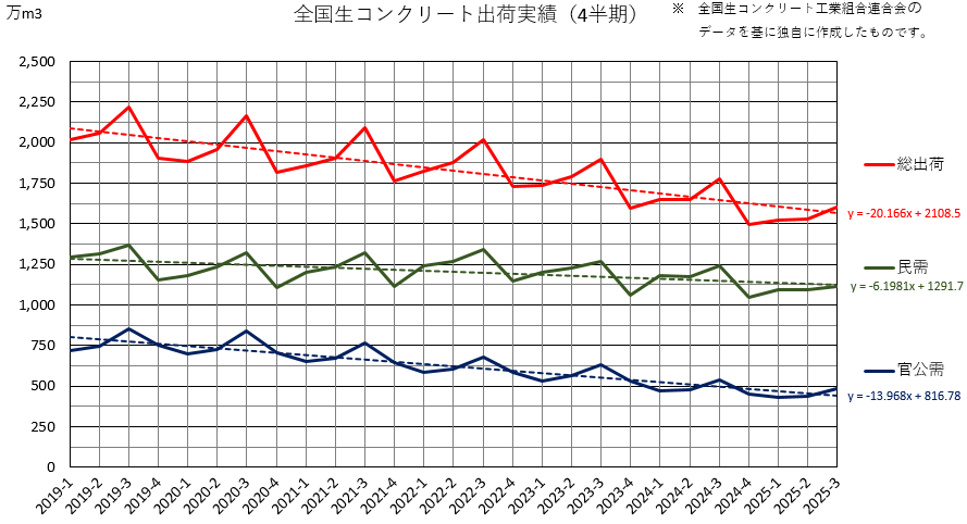 2025年度(2025/4~2026/1)の全国生コンクリート出荷実績は5,086万m3で前年度同月比-8.4%減少した。うち民需は3,607万m3で同-8.0%減少し、官公需は1,479万m3で同-9.2%減少した。