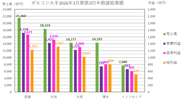 2025年度(2025/4~2026/1)の元請受注高は68.38兆円で前年度比7.4%増加した。うち民間等からの受注高は50.17兆円で同8.6%増加し、公共機関からの受注高は18.21兆円で同4.2%増加した。