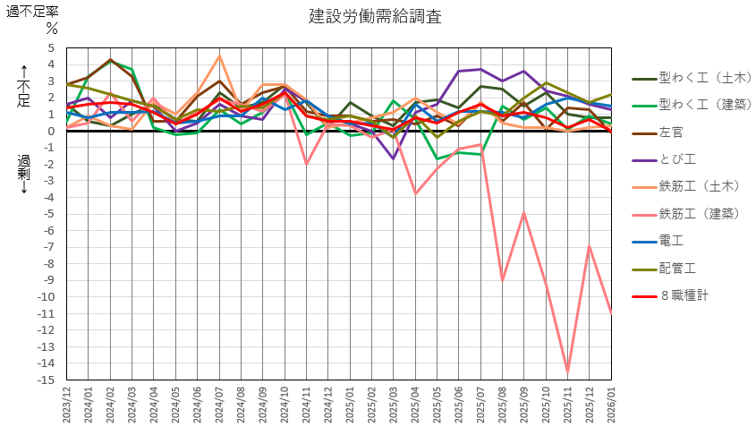 全国の8職種の過不足率は、1月は0.0%の均衡、前月(12月・0.7%の不足)から、0.7ポイント不足幅が縮小した。左官、鉄筋工(建築)で過剰、その他の職種で不足となっている。
