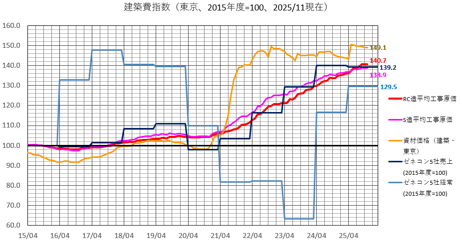 期間:2015/4~2025/11(2015年度を100とした場合の建築費指数)