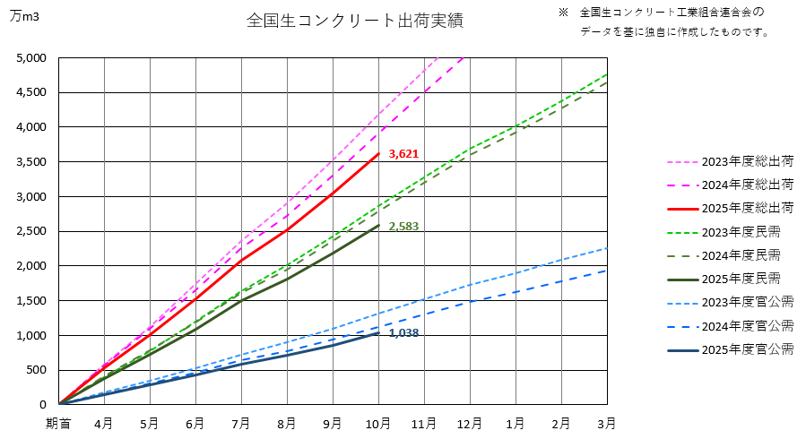 2025年度(2025/4~2025/10)の全国生コンクリート出荷実績は3,621万m3で前年度同月比-7.5%減少した。うち民需は2,583万m3で同-7.4%減少し、官公需は1,038万m3で同-7.7%減少した。