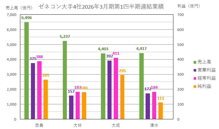 2025年度(2025/4~2025/7)の元請受注高は27.88兆円で前年度比7.9%増加した。うち民間等からの受注高は20.45兆円で同9.9%増加し、公共機関からの受注高は7.44兆円で同2.6%増加した。