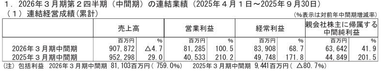 が、2026年3月期第2四半期(中間期)決算短信を発表しました。